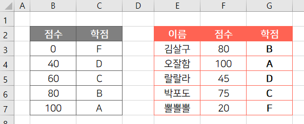 = VLOOKUP (학생점수, 구간테이블, 2, TRUE)